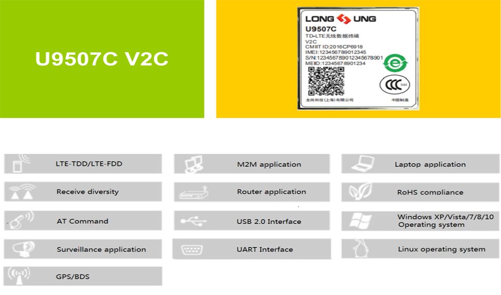 U9507C V2C 是long8国际技术推出的一款 Open linux LTE Cat4 无线通信模块,内置丰富的网络协议,集成多 个标准接口;可以工作在 LTE-TDD/LTE-FDD/TD-SCDMA/UMTS/EVDO/EDGE/GPRS/CDMA/GSM/GPS /BDS 等多种制式。